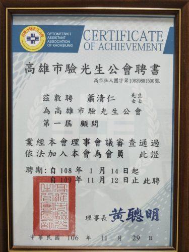 20190114 蕭清仁副教授演講於-高雄市驗光生公會之在職教育積分課程並受聘為其第一屆顧問